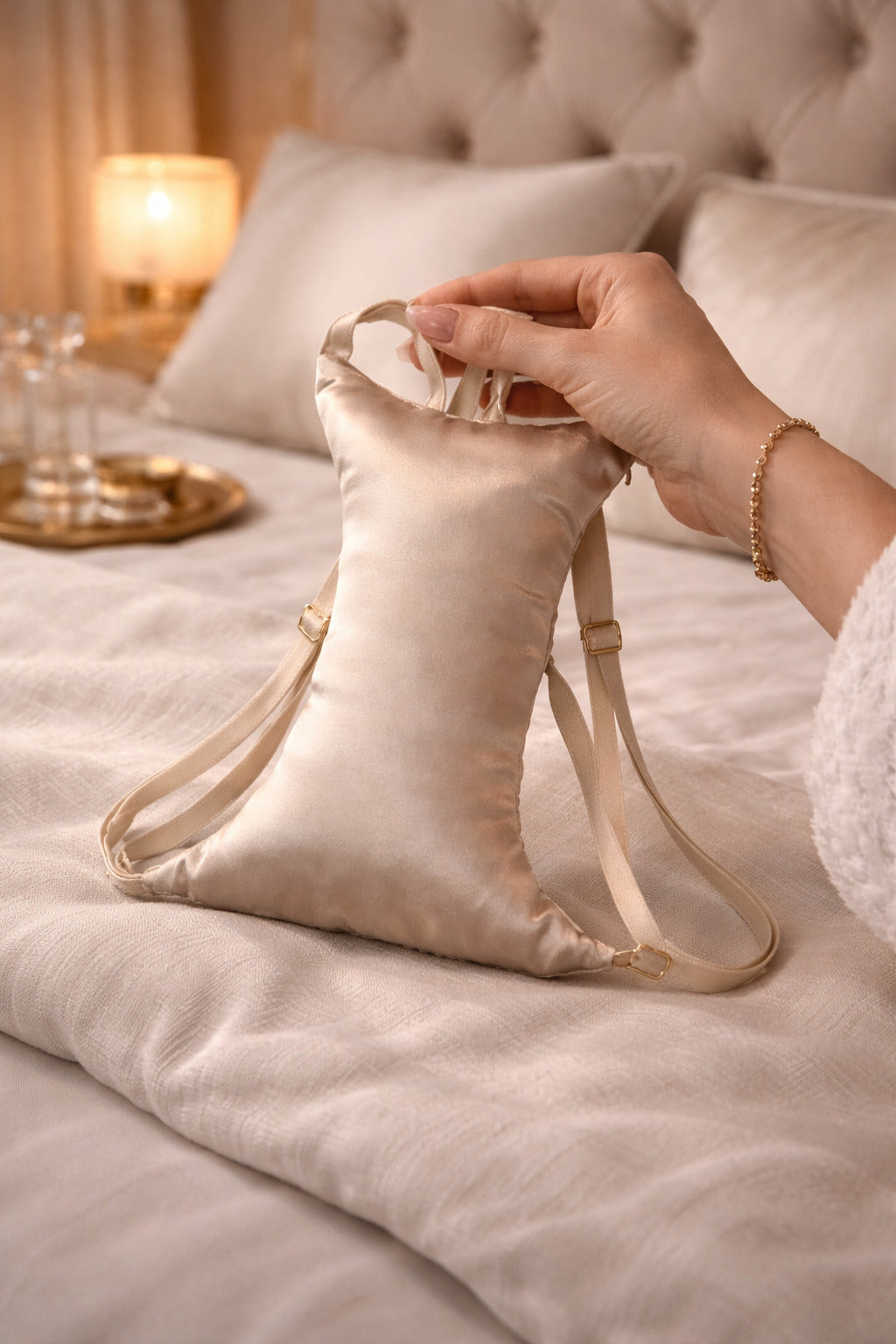 An ergonomic beauty pillow designed for side sleepers that gently supports the chest overnight to help prevent sleep lines and improve comfort while you rest.